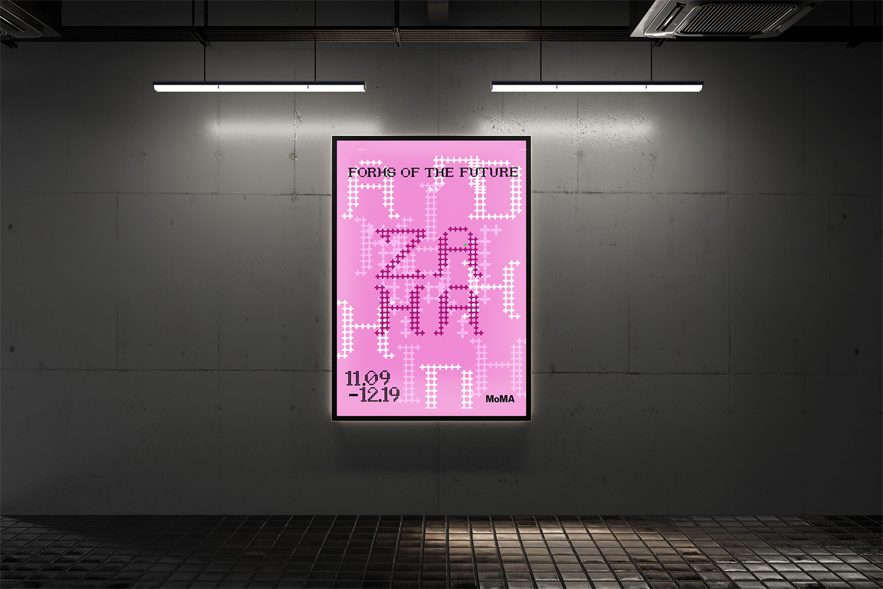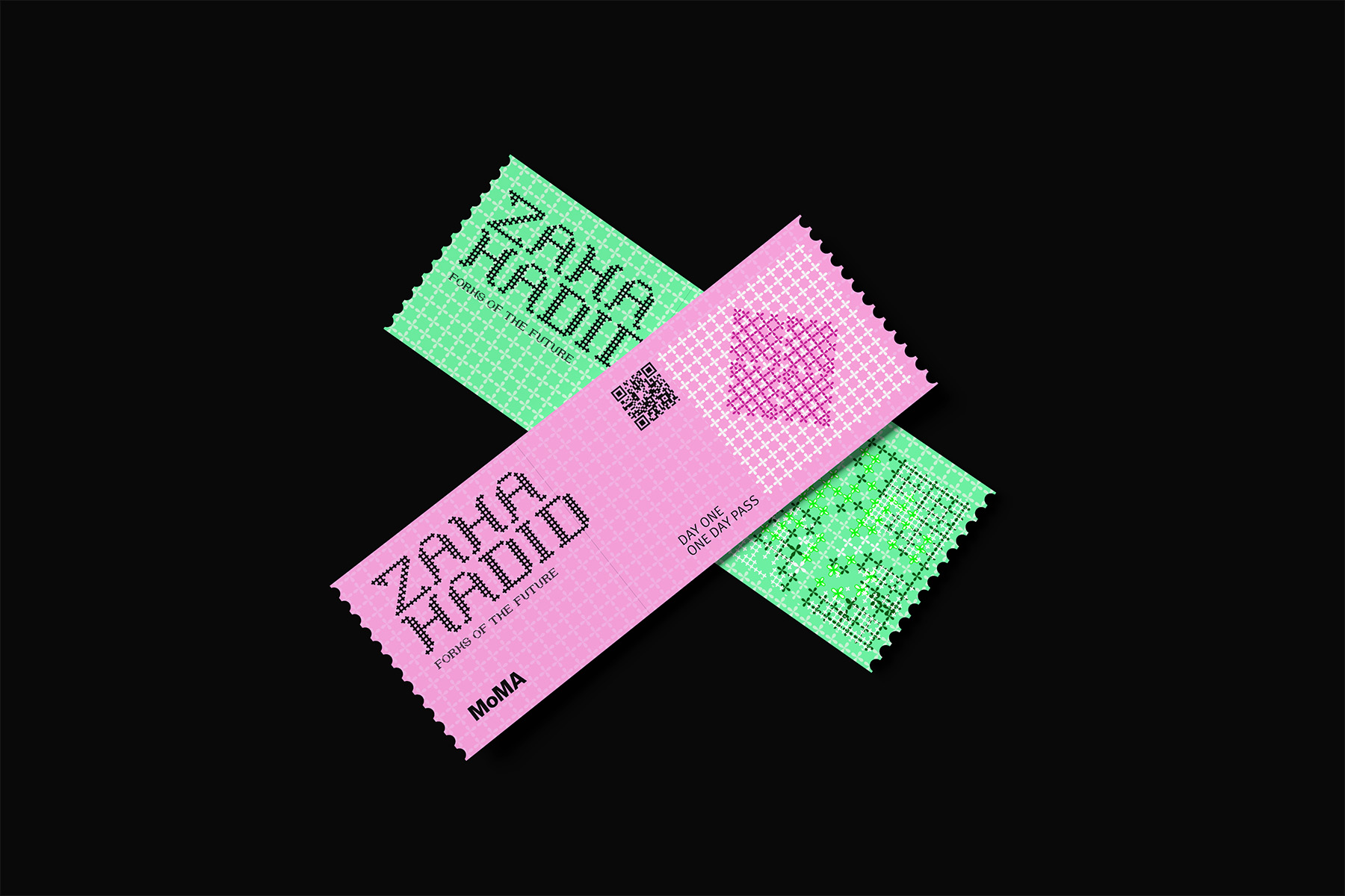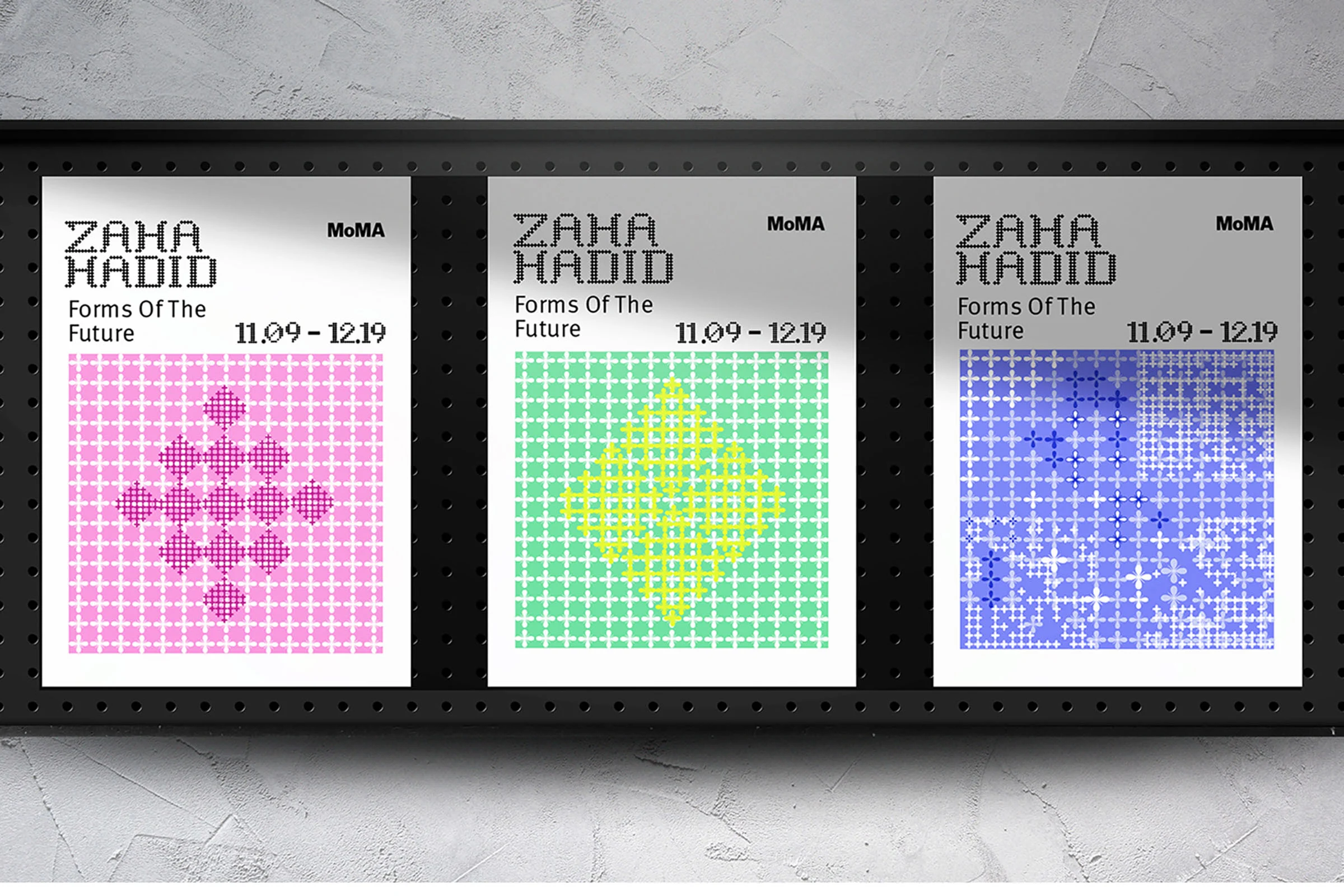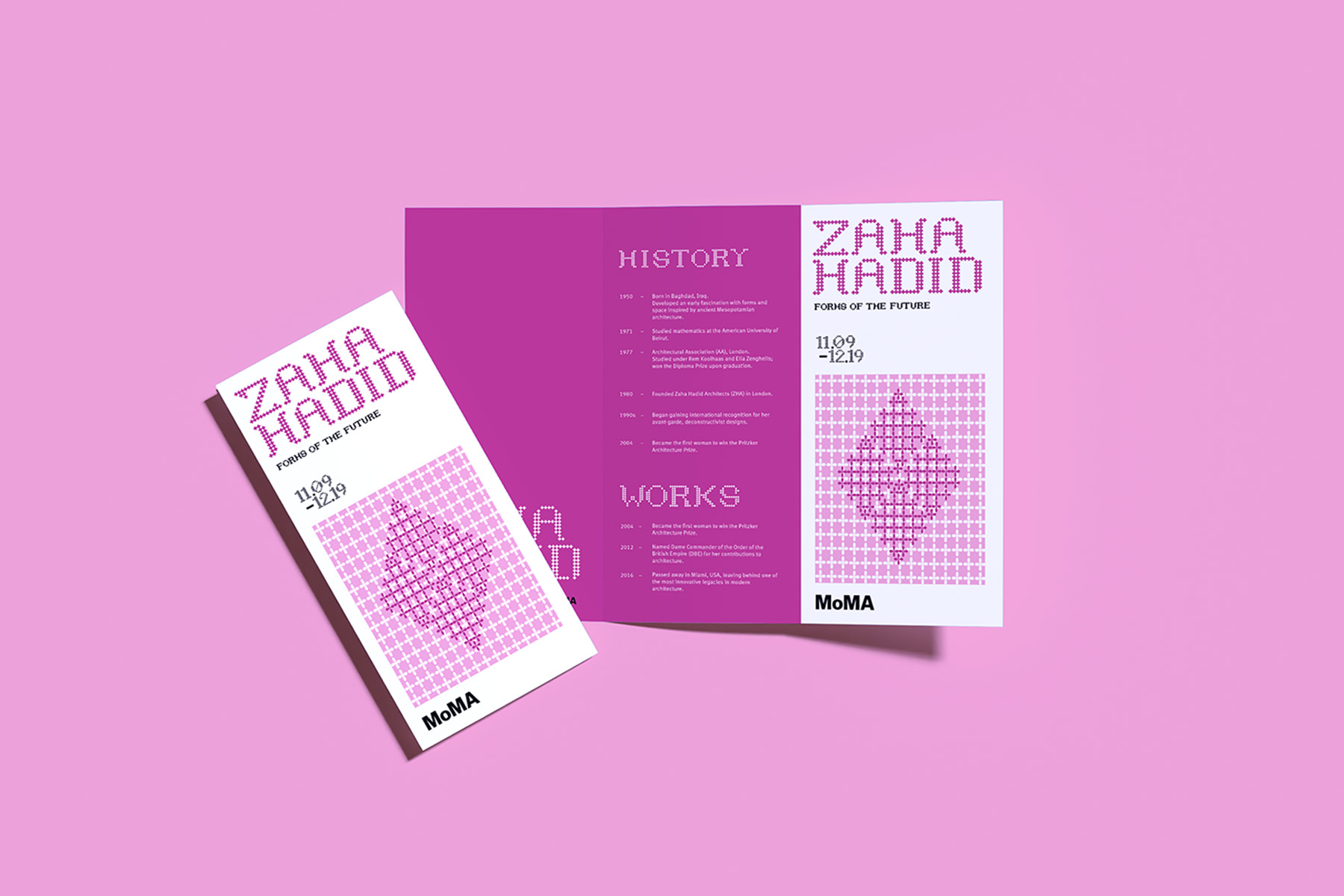 A visual identity for the MoMA exhibition inspired by Zaha Hadid. The system uses custom modular typography and flexible grid structures to reflect her architectural philosophy—fluid, experimental, and forward-looking. The typeface becomes a visual metaphor for her buildings, translating architectural forms into typographic expression.